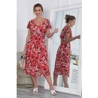 In a flattering fit-and-flare silhouette, this midi dress by Jolie Moi is doused in pretty florals and cut from a premium mesh fabric with full lining. Accentuating the figure with a V neckline and short angel sleeves, it is a laidback faithful that be teamed with a bright shawl to wear to anything from weddings to garden parties. | Jolie Moi Women's Bethany Mesh Midi Dress in Coral | Size: 10 - Manufacturers part number: Jolie Moi_5053319378259