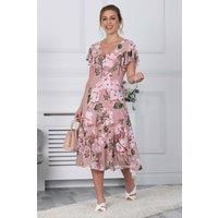An elegant option for all your special occasions, this midi dress by Jolie Moi is fashioned with pretty florals for added charm. Made from soft mesh fabric, it's framed with a v-neckline and soft pleating at the shoulders, while the fabric-covered buttons trailing down the front nods to glamorous vintage silhouettes. Fully lined and completed with concealed back zip fastening, it is comfortable and easy to wear. Add strappy sandals and a clutch for an event-ready look. | Jolie Moi Women's Acela Floral Print Mesh Dress in Dusty Pink | Size: 8 - Manufacturers part number: Jolie Moi_5053319378860