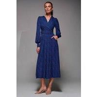 Graceful from top to bottom, this dress from Jolie Moi features a simple but striking animal print which makes it truly distinctive. Versatile with its elegant wrap over v-neckline and smart long sleeves, it is completed with functional pockets and a ruched elasticated waistband which draws in your silhouette for a form-flattering fit. This piece pulls on with sandals for summer days in the sun. | Jolie Moi Women's Nancy Long Sleeve Maxi Dress in Blue | Size: 8 - Manufacturers part number: Jolie Moi_5053319383130