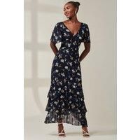 Step into a world of whimsical elegance with the Angel Sleeve Tiered Maxi Dress. This enchanting dress features a playful floral print and is designed with short angel sleeves for a delicate, airy touch. The soft V-neckline adds a flattering element, while the layered tiered hem provides a graceful, flowing effect. Ideal for any event where you want to stand out with sophistication and ease. | Jolie Moi Women's Angel Sleeve Tiered Hem Maxi Dress in Navy | Size: 10 - Manufacturers part number: Jolie Moi_5053319491279