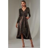 Shimmer and shine at any evening occasion with the Metallic Spot Maxi Dress. Covered in a dazzling metallic design, this dress features elegant long sleeves, a v-neckline, and a self-tie waist belt for a flattering fit. The frill hem with a slit adds a touch of allure, while the back zip ensures a sleek finish. Perfect for making a statement at your next special event. - Manufacturers part number: Jolie Moi_5053319496663