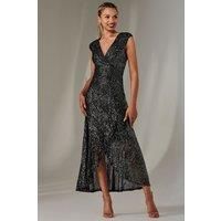 The Sequin Ruffle Hem Maxi Dress from Jolie Moi is a stunning addition to any wardrobe. Featuring a flattering sleeveless design and a stylish V-neck, this dress elegantly showcases your silhouette. The high-low hem adds a playful touch, while shimmering sequins provide a touch of glamour, making it perfect for special occasions or evening outings. Effortlessly chic, this dress combines comfort and sophistication for a standout look. | Jolie Moi Women's Sequin Ruffle Hem Maxi Dress in Metallic Silver | Size: 8 - Manufacturers part number: Jolie Moi_5053319500285
