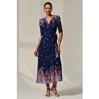Discover effortless sophistication with the Half Sleeve Floral Wrap Dress from Jolie Moi. This elegant piece features a wrap-over design with a self-tie waist belt, allowing for a beautifully tailored silhouette. The ruched elbow-length sleeves add a touch of refined charm, while the soft mesh fabric adorned with an angelic floral print creates a dreamy, ethereal look. Perfect for special occasions. | Jolie Moi Women's Half Sleeve Floral Wrap Dress in Navy | Size: 12 - Manufacturers part number: Jolie Moi_5053319536116