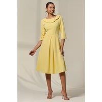 This 50's style dress from Jolie Moi is retro-inspired. Designed in a contemporary structured silhouette and crafted from luxury ponte-de-roma viscose fabric with a hint of stretch, this fit and flare dress is designed with a statement asymmetric Peter Pan collar with a smart button. Fully lined for comfort, it's completed with concealed back zip. cinched waistline and cropped flare sleeves. | Jolie Moi Women's Sloan 3/4 Sleeve Midi Dress in Bright Yellow | Size: 12 - Manufacturers part number: Jolie Moi_5053319537991