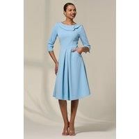This 50's style dress from Jolie Moi is retro-inspired. Designed in a contemporary structured silhouette and crafted from luxury ponte-de-roma viscose fabric with a hint of stretch, this fit and flare dress is designed with a statement asymmetric Peter Pan collar with a smart button. Fully lined for comfort, it's completed with concealed back zip. cinched waistline and cropped flare sleeves. | Jolie Moi Women's Sloan 3/4 Sleeve Midi Dress in Light Blue | Size: 8 - Manufacturers part number: Jolie Moi_5053319538189