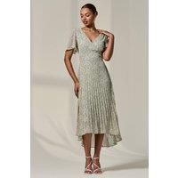 Floral Pleated Dip Hem Maxi Dress from Jolie Moi, a stunning blend of timeless elegance and modern flair. Draped in a beautiful print, this dress is perfect for special occasions. It features short angel sleeves for a delicate, airy feel and pleats that flow into a slightly asymmetric hemline, creating a captivating silhouette. Completed with a back zip fastening for easy wear and a secure fit. | Jolie Moi Women's Floral Pleated Dip Hem Maxi Dress in Green | Size: 20 - Manufacturers part number: Jolie Moi_5053319538950