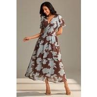 Capture the essence of summer in this effortlessly elegant Chiffon Maxi Dress. Designed with layered angel sleeves that float with every movement, it features a soft V-neckline and a beautifully detailed floral print that brings charm to every step. A delicate tie-up belt cinches the waist for a flattering silhouette, while the back zip fastening ensures a seamless fit. Fully lined for comfort and grace, this dress is the perfect choice for garden parties, weddings, or sun-soaked strolls. | Jolie Moi Women's Layered Angel Sleeved Chiffon Maxi Dress in Brown | Size: 12 - Manufacturers part number: Jolie Moi_5053319541332