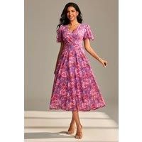 Effortlessly elegant, the Flutter Sleeve Mesh Maxi Dress by Jolie Moi is designed to flatter and flow. Draped in a striking abstract print over lightweight mesh, its faux wrap V-neckline softly frames your dcolletage, while layered angel sleeves flutter with ethereal charm. Finished with a stretchy waistband, to ensures a comfortable, flattering fit, and two discreet side pockets. | Jolie Moi Women's Flutter Sleeve Mesh Maxi Dress in Purple | Size: 18 - Manufacturers part number: Jolie Moi_5053319541660