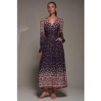 The Mirrored Print Long Sleeve Mesh Maxi Dress by Jolie Moi features a flattering wrap-style front with a V neckline. The thicker waistband is gathered at the sides, creating a draped effect, and includes a tie for added detail. The skirt features gentle pleats and two side pockets for convenience. The sleeves are slightly sheer, with shirring starting at the wrist and gently flaring out, adding a touch of elegance. With its slightly shorter front hemline, this dress is perfect for both casual and formal occasions. | Jolie Moi Women's Mirrored Print Long Sleeve Mesh Maxi Dress in Purple | Size: 10 - Manufacturers part number: Jolie Moi_5053319544241