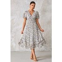 Fall in love with our Frill Hem Chiffon Midi Dress from Jolie Moi, the newest addition to your staple occasion wardrobe. Adorned in a beautiful abstract animal print with gold fleck detailing, this midi dress falls to the perfect length, crafted from soft airy chiffon. The double layered angel sleeves are complimented by a flattering shirred waistband that shapes the body perfectly, as well as featuring a frill hem for that feminine flare. This over the head style has a v neck both front and back for easy wearing, as well as discreet side front pockets. | Jolie Moi Women's Frill Hem Chiffon Midi Dress in Purple | Size: 10 - Manufacturers part number: Jolie Moi_5053319545156