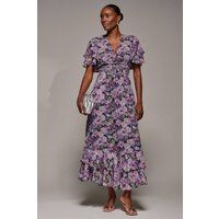 Feel fabulous in our Chiffon Layered Sleeve Ruffle Hem Midaxi Dress, featuring a dreamy water-inspired floral print that captivates at first glance. The gently layered flutter sleeves add a soft, romantic touch, while the flattering V-neckline leads into a shirred waist panel that contours and defines your silhouette. The flowing maxi skirt finishes with delicate ruffles at the hem and a charming tie-up detail at the back. Crafted for effortless elegance, this dress is perfect for any occasion where you want to feel effortlessly beautiful. | Jolie Moi Women's Chiffon Layered Sleeve Ruffle Hem Midaxi in Black | Size: 8 - Manufacturers part number: Jolie Moi_5053319547259