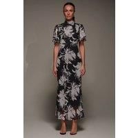 The High Neck Maxi Dress by Jolie Moi features a high neckline adorned with subtle pleats at the centre, complemented by two-layered angel sleeves. The back is finished with a concealed zip and a tie fastening at the neck, ensuring a seamless fit and graceful silhouette. | Jolie Moi Women's High Neck Angel Sleeve Chiffon Maxi Dres in Black | Size: 12 - Manufacturers part number: Jolie Moi_5053319551539