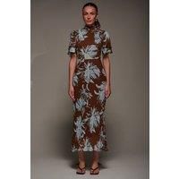 The High Neck Maxi Dress by Jolie Moi features a high neckline adorned with subtle pleats at the centre, complemented by two-layered angel sleeves. The back is finished with a concealed zip and a tie fastening at the neck, ensuring a seamless fit and graceful silhouette. | Jolie Moi Women's High Neck Angel Sleeve Chiffon Maxi Dres in Brown | Size: 10 - Manufacturers part number: Jolie Moi_5053319551584