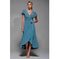 Metallic Angel Sleeve Wrap Maxi Dress, designed to make a statement with its bold metallic pattern. This stunning dress features short, flowy sleeves and a flattering V-neckline, enhanced by a slight front split hem that adds a touch of allure. The self-tie waist belt cinches the silhouette beautifully, while two convenient side pockets offer practicality. Completed with a back zip fastening. | Jolie Moi Women's Metalic Angel Sleeve Wrap Maxi Dress in Blue | Size: 12 - Manufacturers part number: Jolie Moi_5053319552734