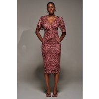 Feel beautiful in our Print Mesh Angel Sleeve Dress, crafted from soft airy mesh fabric adorned in a gorgeous print, flattering the body perfectly due to its bodycon silhouette. The pleated waist detailing and double layered ruffle sleeves add an elegant touch to this midi dress, with a gorgeous v neckline and soft jersey lining for extra comfort. Perfect for any occasion, this dress is easy to wear with a concealed zip at the back. - Manufacturers part number: Jolie Moi_5053319553700