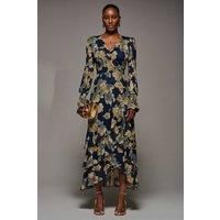 Long Mesh Maxi Dress by Jolie Moi features long sleeves with shirred wrists that naturally flare out. The V-neckline and wrap-style front enhance the flattering silhouette, while the belt cinches the waist. The three-tiered ruffle hemline is slightly shorter in the front so the dress sways beautifully as you walk. | Jolie Moi Women's Long Sleeve Ruffle Hem Mesh Maxi Dress in Navy | Size: 10 - Manufacturers part number: Jolie Moi_5053319554370