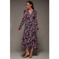 Long Mesh Maxi Dress by Jolie Moi features long sleeves with shirred wrists that naturally flare out. The V-neckline and wrap-style front enhance the flattering silhouette, while the belt cinches the waist. The three-tiered ruffle hemline is slightly shorter in the front so the dress sways beautifully as you walk. | Jolie Moi Women's Long Sleeve Ruffle Hem Mesh Maxi Dress in Black | Size: 12 - Manufacturers part number: Jolie Moi_5053319554509