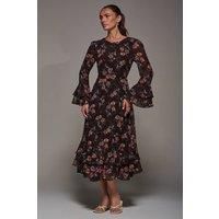 This floaty chiffon piece features tiered ruffle cuffs and a matching hem that sits at the perfect midi length, complimented by a simple round neckline and tie waistband to create extra shape. Featuring discreet front side pockets and a concealed centre back zip, this dress is easy to wear due to its back v neckline, as well as being fully lined for comfort. | Jolie Moi Women's Long Sleeve Chiffon Frill Midaxi Dress in Burgundy | Size: 8 - Manufacturers part number: Jolie Moi_5053319554905