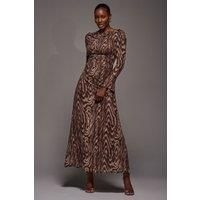 Exude effortless chic in the Long Sleeve Slash Neck Maxi Dress from Jolie Moi, perfect for your next autumn winter wedding, adorned in a gorgeous abstract print that cascades over soft airy mesh fabric, this is the dress of the season. Featuring a flattering slash neckline that also has a slight cowl to it, and ruched waist detailing, this dress provides shape and comfort being fully lined with soft jersey fabric. The flared asymmetric sleeves with split detailing add a fun feminine feel to this over the head style, ready for the new season ahead. | Jolie Moi Women's Long Sleeve Slash Neck Maxi Dress in Brown | Size: 10 - Manufacturers part number: Jolie Moi_5053319555513