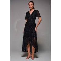 The Sequin Ruffle Hem Maxi Dress by Jolie Moi is designed with delicate sequin embellishment throughout. It features soft angel sleeves, a crossover V-neckline, and an asymmetric hem with a gentle frill. Perfect for adding subtle evening glamour to any occasion. | Jolie Moi Women's Sequin Angel Sleeve Ruffle Hem Maxi Dress in Black | Size: 12 - Manufacturers part number: Jolie Moi_5053319562191