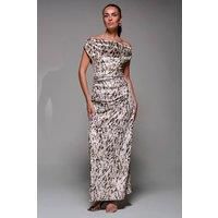 The Printed Velvet Draped Maxi Dress by Jolie Moi dress features an off-shoulder design and a round ruched neckline. Made from luxurious printed velvet, it offers a flattering maxi silhouette and is fully lined for comfort. The draped detailing adds an elegant touch, making it a perfect choice for evening events. | Jolie Moi Women's Printed Velvet Draped Maxi Dress in Beige | Size: 12 - Manufacturers part number: Jolie Moi_5053319566311