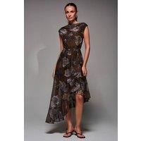 The Asymmetrical Draped Mesh Midaxi Dress by Jolie Moi features a slash neckline with gentle gathering at the shoulder. This sleeveless design is accented by a delicate frill that starts at the waist and cascades down to the hem, creating a graceful, flowing silhouette. | Jolie Moi Women's Asymmetrical Draped Mesh Midaxi Dress in Brown | Size: 14 - Manufacturers part number: Jolie Moi_5053319566519