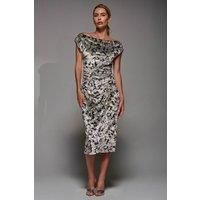 The Print Velvet Ruched Bodycon Dress by Jolie Moi is featuring an asymmetric silhouette with a ruched round neckline. Made from luxurious printed velvet, it offers a flattering bodycon fit that elegantly hugs the figure. The centre back slit enhances movement, making it a chic choice for evening events. | Jolie Moi Women's Velvet Print Ruched Bodycon Dress in Beige | Size: 14 - Manufacturers part number: Jolie Moi_5053319567424