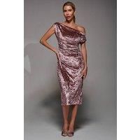The Print Velvet Ruched Bodycon Dress by Jolie Moi is featuring an asymmetric silhouette with a ruched round neckline. Made from luxurious printed velvet, it offers a flattering bodycon fit that elegantly hugs the figure. The centre back slit enhances movement, making it a chic choice for evening events. | Jolie Moi Women's Velvet Print Ruched Bodycon Dress in Pink | Size: 12 - Manufacturers part number: Jolie Moi_5053319567530