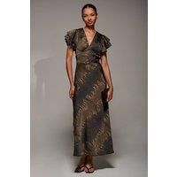 The Ruffle Satin Maxi Dress from Jolie Moi features a V neckline, two-tier ruffle short sleeves, and a flare skirt. Made from delicate satin, the dress is fully lined & offers a tie at the waist and at the back of the neck for a flattering fit. The maxi length adds elegant coverage, perfect for both day and evening occasions. | Jolie Moi Women's Ruffle Sleeve Print Satin Maxi Dress in Brown | Size: 14 - Manufacturers part number: Jolie Moi_5053319570523