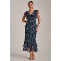 The Ruffle Neck Midaxi Dress from Jolie Moi. Featuring short ruffle sleeves and a ruffle V-neckline, this dress is made from lightweight chiffon and fully lined for comfort. The three-tiered ruffle skirt adds playful volume, flowing into a Midaxi length for a feminine and elegant silhouette. | Jolie Moi Women's Ruffle V Neckline Chiffon Midaxi Dress in Teal | Size: 16 - Manufacturers part number: Jolie Moi_5053319570653