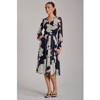 The Printed Mesh Midi Dress from Jolie Moi. Made from delicate mesh fabric & fully lined for comfort, the dress features a wrap V-neck and long shirred cuffed flare sleeves. A thick waistband with a tie at the back adds a flattering silhouette, whilst convenient pockets offer practicality. A pleated skirt falling to a Midi length finishes the look, adding gentle, graceful movement. | Jolie Moi Women's Long Sleeve Printed Mesh Midi Dress in Navy | Size: 10 - Manufacturers part number: Jolie Moi_5053319571766