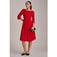 The Fold Collar Button Dress from Jolie Moi. Made from a lightweight, structured polyester blend, this Midi dress offers a sleek and tailored fit. It features 3/4-length sleeves and a distinctive V-shaped pleat at the front that creates subtle, elegant drapes. The fit-and-flare silhouette is complemented by a classic fold collar with a button detail and zip fastening, along with practical pockets for added convenience. Ideal for both workdays and stylish weekend outings. | Jolie Moi Women's Fold Collar Button Detail Dress in Red | Size: 14 - Manufacturers part number: Jolie Moi_5053319573098