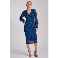 The Ruffle Mesh Bodycon Dress from Jolie Moi features a V ruffle neckline with a tie at the back of the neck and long sheer ruffle cuffed sleeves. Made from mesh fabric, it is ruched at the waist and fully lined for a flattering fit. The midi length adds a chic touch, perfect for making a stylish statement at any event. | Jolie Moi Women's Long Sleeve Ruffle Detail Mesh Bodycon Dress in Blue | Size: 8 - Manufacturers part number: Jolie Moi_5053319575078