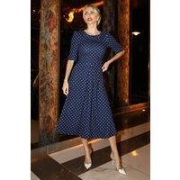 The Scuba Collar Midi Dress from Jolie Moi features a fold collar with button detail, three-quarter length sleeves, and a distinctive V-shaped pleat at the front that creates subtle, elegant drapes. Made from scuba material, it offers discreet pockets, a zip fastening, and is fully lined for comfort. The midi length provides a stylish and versatile silhouette, perfect for both work and weekend occasions. | Jolie Moi Women's Printed Scuba Fold Collar Midi Dress in Navy | Size: 18 - Manufacturers part number: Jolie Moi_5053319575320