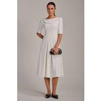 The Scuba Collar Midi Dress from Jolie Moi features a fold collar with button detail, three-quarter length sleeves, and a distinctive V-shaped pleat at the front that creates subtle, elegant drapes. Made from scuba material, it offers discreet pockets, a zip fastening, and is fully lined for comfort. The midi length provides a stylish and versatile silhouette, perfect for both work and weekend occasions. | Jolie Moi Women's Printed Scuba Fold Collar Midi Dress in White | Size: 10 - Manufacturers part number: Jolie Moi_5053319575368