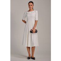 The Scuba Collar Midi Dress from Jolie Moi features a fold collar with button detail, three-quarter length sleeves, and a distinctive V-shaped pleat at the front that creates subtle, elegant drapes. Made from scuba material, it offers discreet pockets, a zip fastening, and is fully lined for comfort. The midi length provides a stylish and versatile silhouette, perfect for both work and weekend occasions. | Jolie Moi Women's Printed Scuba Fold Collar Midi Dress in White | Size: 14 - Manufacturers part number: Jolie Moi_5053319575382