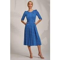 Sleeve Printed Jersey Midi Dress by Jolie Moi features a round neckline with delicate pleats, a ruched waistband with two pockets, and a flowing pleated skirt. The 3/4 length sleeves are slightly gathered, and finished with a tie at the waist. Models height-170cm, and wears size 8, length 116cm. | Jolie Moi Women's Sleeve Printed Jersey Midi Dress in Blue | Size: 10 - Manufacturers part number: Jolie Moi_5053319579939
