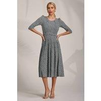 Sleeve Printed Jersey Midi Dress by Jolie Moi features a round neckline with delicate pleats, a ruched waistband with two pockets, and a flowing pleated skirt. The 3/4 length sleeves are slightly gathered, and finished with a tie at the waist. Models height-170cm, and wears size 8, length 116cm. | Jolie Moi Women's Sleeve Printed Jersey Midi Dress in Dark Navy | Size: 10 - Manufacturers part number: Jolie Moi_5053319580010
