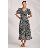 The Puff Sleeve Printed Lace Maxi Dress by Jolie Moi features a wrap front with a V-neckline and a slightly gathered waistband that flows into a pleated skirt, with two pockets. Fully lined, the design is completed with short puff sleeves and a concealed zip at the back. Models height-170cm, and wears size 8, length 132cm. | Jolie Moi Women's Puff Sleeve Printed Lace Maxi Dress | Size: 20 - Manufacturers part number: Jolie Moi_5053319581314