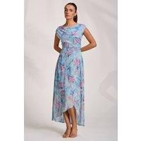 Effortlessly stunning, the Asymmetric Draped Mesh Maxi Dress from Jolie Moi will make heads turn at your next special occasion, featuring our signature cowl neckline with pleated shoulder detailing. Adorned in a unique abstract print, this dress is crafted from a soft mesh fabric that fall beautifully over the body, creating the most flattering shape. The asymmetric draped hem falls to the perfect maxi length due to its bias cut, and is complimented by short, capped sleeves and ruched side detailing, as well as a tie belt at the back. This over the head style is fully lined for comfort. | Jolie Moi Women's Asymmetric Draped Mesh Maxi Dress in Blue | Size: 18 - Manufacturers part number: Jolie Moi_5053319584858