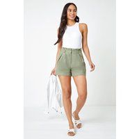 Paperbag Waist Linen Shorts from Roman. Channel a utilitarian and chic feel in these flattering linen shorts. Featuring an edge frill with hook and bar closure on the waistband and front pockets. Detailed with front side darts creating a feminine silhouette, these linen shorts are the perfect go to all season long. Style with a blouse tucked in and a belt for a more refined on the go look, or paired with a short sleeve top and trainers for a casual day out. - Manufacturers part number: Dusk_5054025842409