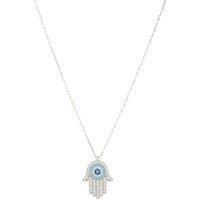 Adorn yourself with this beautiful Hamsa Hand With Evil Eye Pendant Necklace and attract good luck and safety into your life. This exquisite piece of jewellery is sure to charm you with its uplifting energy!Handcrafted from 925 sterling silver and adorned with sparkling multi-faceted white and blue zircons depicting an evil eye at the centre of the palm of the hand, this chic necklace is perfect for everyday styling. Whether you want to wear it on its own to add a subtle hint of sparkle to your look, or...