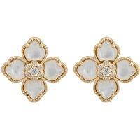Enhance your elegance with our flower clover mother of pearl stud earrings. Crafted from 925 sterling silver and dipped in 18ct gold, these earrings feature four petals each adorned with Mother of Pearl, a gemstone symbolizing purity, tranquility, and protection in jewellery. At the centre of each flower clover stud, to create the disc floret, sits sparkling zirconia. Designed in the shape of a four-leaf clover, these earrings not only add a touch of luxury but are also considered to bring good luck. Th...