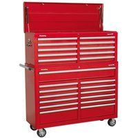 • Extra-wide tool chests designed to take our modular tool trays.• Topchest lid fitted with gas dampers for smooth opening and closing.• All heavy gauged steel construction and manufactured with steel inner walls for extra strength and durability.• Heavy-duty 45mm ball-bearing drawer slides provide superior performance and carry heavier loads.• Full height rear locking mechanism, locks full-length drawers in multiple locations.• Added security provided by cylinder locks. Supplied with two keys.• Rust and solvent resistant powder coat paint finish.• Each drawer features stylish aluminium drawer pulls and non-slip liners.• Fitted with four extra-heavy-duty ø125mm PU/PP alloy wheels, two castors with large toe locks and two fixed wheels.Package includes:• AP5210T - Topchest 10 Drawer with Ball-Bearing Slides - Red• AP5213T - Rollcab 13 Drawer with Ball-Bearing Slides - RedExtra-wide tool chests designed to take our modular tool trays. Topchest lid fitted with ga... - Manufacturers part numbers: AP52COMBO1|Sealey_