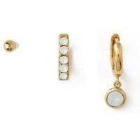 Orelia White Opal Ear Party Made With Swarovski Crystals Three individual earrings, a ball stud, gold huggie with a row of Swarovski white opals and a matching drop huggie hoop by Orelia. This Jewellery is plated in 18k gold. Width: 1 CM Fashion Jewellery Type: Earrings 18k Gold Plated Swarovski Crystals
