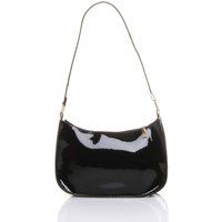 A chic structured handbag crafted from smooth faux patent leather. Features a shoulder strap and fastens with a gold-tone zip. Stylish, bold, and easy to pair with any outfit. | AJVANI Women's Scoop Shoulder Bag in Black - Manufacturers part number: AJVANI_5055664874301