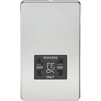 The Knightsbridge SF8900PC / SF8900PCW Polished Chrome Shaver Socket is the ideal decorative upgrade for use in the modern home, businesses and hotels. The screwless design features an easy clip on cover with an internal gasket for moisture protection and matching screws. It has an ultra slim profile and is constructed from durable, and high temperature resistant thermoset plastic. The slimline design will takes dual 115/230 voltage and comes with transformer and isolates the mains supply making it safe and suitable for bathroom zone 3 use. It accepts US, Australian, European and UK 2 pin plugs. Made from thermoset plastic and available with Black or White Socket Inserts. The socket is compact in design, measuring 87.5mm wide x 148.5mm high and made to fit onto a standard 47mm 2 Gang Back box and comes with fixing screws. It complies with all relevant British Standards and CE marked and comes complete with a 15 Year manufacturers Guarantee. Some products go perfectly with thi... - Manufacturers part numbers: Knightsbridge_SF8900PC|SF8900PC