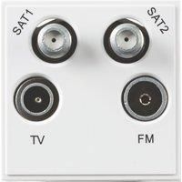 Fully screened Satellite, TV and FM/DAB aerial triplexed outlet with separate Sat 2 outlet. Ideal for Sky™ and Sky+™ applications with low loss, minimal ingress and negligible module cross talk with excellent matching and isolation. - Fully screened to EN 50083-2. - Easy cable connections and access. - Suitable for cables with 1mm conductor (PF100, H109F, QF100, etc.). - Min mounting depth 35mm. - Size: 50 x 50mmTechnical Specification:Recessed Depth (mm): 31Min. Mounting Box Depth (mm): 35mmConstruction: ABSFinish: WhiteIP Rating: IP20TV Connection Type: MaleSAT Connection Type: F-TypeFM/DAB Connection Type: FemaleTerminal: Clamp & Screw TerminalDimensions: Height: 50mmWeight: 0.094KgWarranty: 1 Year - Manufacturers part number: NETQDWH