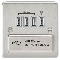 Ideal solution for multiple users, dedicated Quad USB charger. Flat Plate low profile metal design with matching metal rockers. Perfect for Coffee shops. foyers, receptions, hotel rooms etc. - Quad USB Charging 5V DC5.1A (shared) - Dedicated 2.1A outlet for tablets - 3 outlets sharing 3A for multiple smart phones and other devices - Ultra low profile design with built in gasket - Certified to BS EN 60670, EN 60950-1 - EMC Certified and ErP Ready - Minimum mounting box depth 25-35mm**dependent on wiring conditionsWE RECOMMEND YOU ALWAYS USE CERTIFIED USB CABLES FOR SAFETY AND TO ENSURE COMPATIBILITYSpecification: Projection (mm): 2.5Min. Mounting Box Depth (mm): 25mmConstruction: Premium grade steelFinish: Brushed ChromeIP Rating: IP20Primary Voltage: 230V 50HzEarth Terminal: Yes - Manufacturers part number: Knightsbridge_KNI002-FPQUADBCG