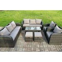 Set contents: This set comes with two triple-seat love sofas, two reclining chairs, two footstools and a 5mm tempered glass topped dining table. Rattan garden set: Get a 10 Seat Rattan Garden Furniture Set. Colour: This set features a dark grey wicker rattan with light grey cushions, making it an elegant centrepiece to any garden. Rattan design: Made from UV treated and fade resistant polyrattan material which can be left outside all year round. Cushions: You'll also receive comfortable 8cm thick weath...